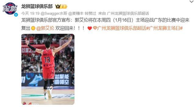 广州队官方通知:郭艾伦将于本月16号买球网体育信息,即本周四对阵广东队比赛中复出。