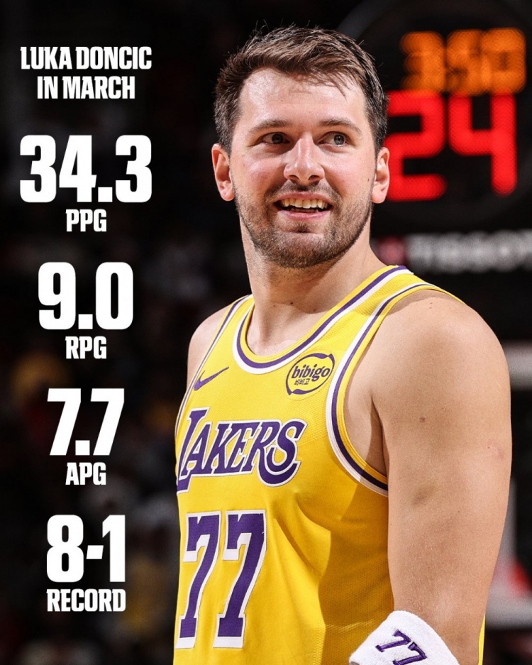 东契奇三月场均砍下34.3分9.0篮板7.7助攻体育录像/图片,教导球队赢得8胜1负的战绩。 |