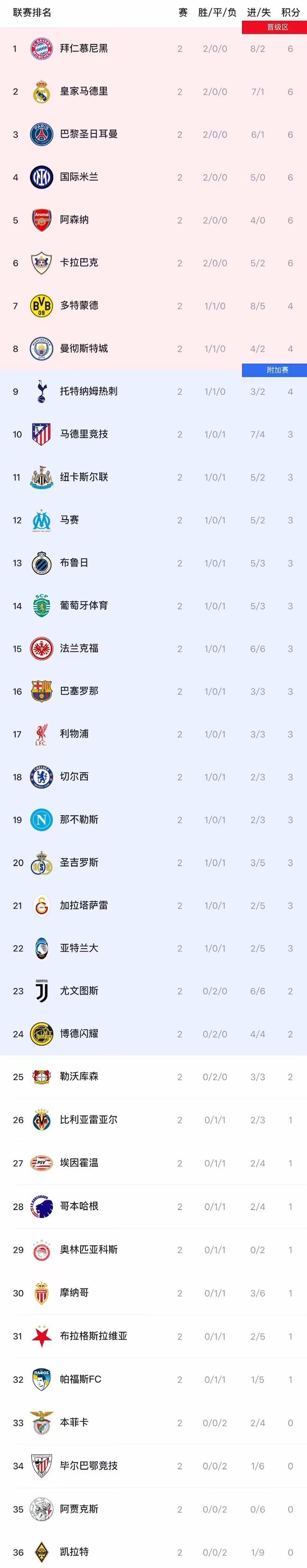 虎扑10月02日讯 欧冠小组赛第2轮18场比赛一说念死心,焦点战中巴黎2-1打败巴萨。关节场次里,五大联赛权门纷纷取胜:皇马客场5-0大捷凯拉特,切尔西1-0小胜本菲卡,拜仁客场5-1横扫帕福斯,那不勒斯2-1力克葡萄牙体育,阿森纳2-0打败奥林匹亚科斯。另一方面,利物浦客场0-1不敌加拉塔萨雷,碰到连败,而曼城则在客场被摩纳哥2-2逼平。 至此,在欧冠积分榜上,两战全胜同积6分的有6支球队体育赛事直播,按净胜球上风名次,前6名永诀是拜仁、皇马、巴黎、国米、阿森纳和阿塞拜疆球队卡拉巴赫,曼城一胜一平第8名,巴塞罗那、利物浦、切尔西同积3分,排名第16、17、18名。 |