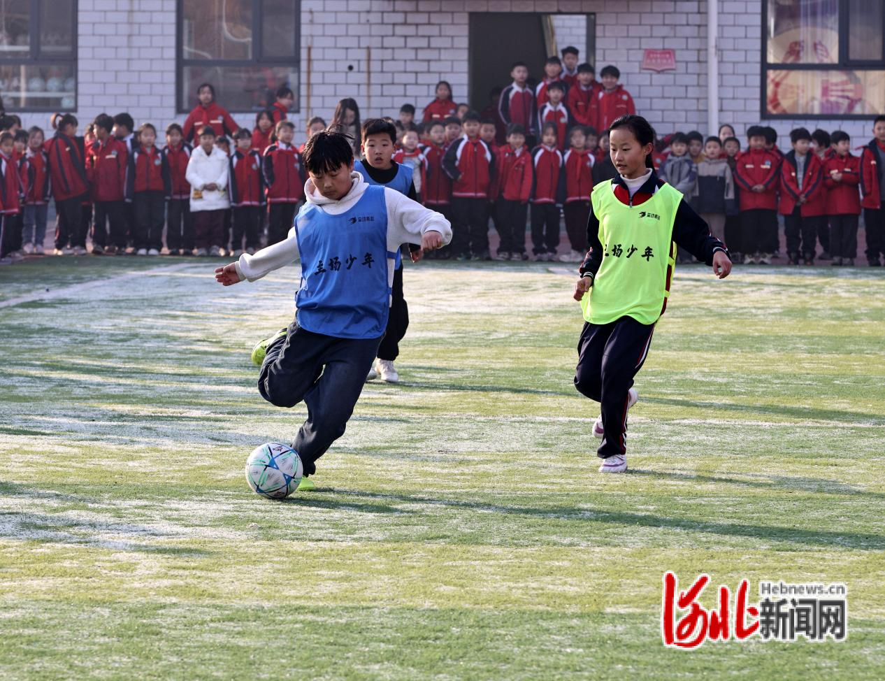 12月24日,在广宗县西关小学足球场体育赛事直播,两边球员在热烈拼抢。